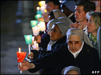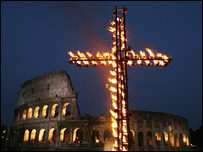 اٹلی کے دارالحکومت روم میں ہزاروں زائرین نے ایسٹر کے سلسلہ میں ہفتہ بھر کی تقریبات اور اجتماعات کا آغاز کیا ہے۔ اس سلسے میں پاپائے روم پوپ بینیڈکٹ دنیا بھر کے مسیحوں کے نام اپنا خصوصی پیغام اتوار کی صبح ایک دعائیہ تقریب میں دیں گے۔ جمعہ اور سنیچر کی درمیانی رات انہوں نے روم کے قدیم بڑے کلیسا میں گڈ فرائیڈے کی خصوصی رسومات ادا کیں۔ ایسٹر حضرت عیسیٰ کو دی جانے والی اذیتوں اور انہیں مصلوب کیے جانے کی یاد میں منایا جاتا ہے۔ جمعہ کی رات شمعیں اٹھائے ہزاروں عام زائرین اور رومن کیتھولک چرچ کی اہم شخصیات نے پوپ کی قیادت میں ایک جلوس نکالا جو دو ہزار سال پرانے کھنڈرات کے پرپیچ راستوں سے گزرا۔ سنیچر کی رات پوپ بینیڈکٹ سینٹ پیٹرز کے چرچ میں ایسٹر کے نصف رات کے اجمتاع میں بھی شریک ہوں گے۔ یہ اجتماع جوں ہی شروع ہوگا چرچ کی تاریکی میں ڈوبی ہوئی اس عظیم الشان عمارت میں ہر طرف یکایک روشنی کر دی جائے گی جو حضرت عیسیٰ کے دوبارہ اٹھا لیے جانے کے وقت کی عکاسی کرے گی۔