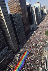 برازیل کے شہر ساؤ پالو میں لاکھوں کی تعداد میں گے اور لیسبین افراد نے گے پرائیڈ پریڈ میں حصہ لیا ہے۔ اس پریڈ کے منتظمین کا کہنا ہے کہ اس مرتبہ پریڈ میں شامل افراد کی تعداد گزشتہ سال اسی طرح کی ایک تقریب میں شامل دو اعشاریہ پانچ ملین لوگوں سے بھی بڑھ گئی۔ دنیا میں اپنی طرح کی یہ واحد پریڈ کہلاتی ہے۔ پریڈ کے شرکاء مختلف لباس زیب تن کیے ہوئے جن میں جنسِ مخالف کا لباس پہنے والے افراد بھی شامل ہیں، موسیقی بجاتے ہوئے پریڈ میں شریک ہوئے۔ تاہم اس تقریب کے سرگرم حامی کہتے ہیں کہ پریڈ کا پیغام ایک مطالبہ ہے کہ دنیا میں امتیاز نہیں ہونا چاہیے۔ پریڈ کے صدر نیلسن میٹیاس پریرا کے مطابق: ’ہم برازیل میں آج بھی پائے جانے والی نسلی تعصب اور مردانگی پر اترانے جیسے مسائل کو اجاگر کرنا چاہتے ہیں‘۔ پریڈ کے حامیوں کا کہنا ہے کہ برازیل میں انیس سو اسی اور سنہ دو ہزار چھ کے درمیان لگ بھگ دو ہزار چھ سو اسی گے افراد کو قتل کیا گیا۔ مرنے والوں میں اکثریت کی ہلاکت کی وجہ ان کی سیکشوئیلٹی تھی۔ اس پریڈ کو پہلی مرتبہ سرکاری سطح پر حمایت ملی ہے اور اس میں برازیل کے کھیلوں اور سیاحت کے وزیر کے علاوہ دیگر مقامی اہلکار بھی شامل ہوئے۔ انیس سو ستانوے میں جب شہر میں پہلی مرتبہ اس طرح کی پریڈ ہوئی تھی تو صرف دو ہزار افراد نے اس میں شرکت کی تھی۔ گے پرائیڈ کی پریڈ اسی شہر میں کچھ دن قبل سالانہ مسیحی تقریب کے بعد منعقد ہوئی ہے جس میں ایک وزیر نے خطاب کے دوران یہ کہا تھا کہ ہم جنسیت، شیطنت ہے۔ برازیل میں ستر کے قریب گے پریڈوں کا انعقاد ہوتا ہے اور بی بی سی کے نامہ نگاروں کے مطابق اب صورتِ حال تبدیلیوں کی عکاسی کر رہی ہے۔ کچھ ریاستیں اب کھلے عام جنسی وجوہ پر امتیاز کی مخالفت کرتی ہیں۔ پھر بھی ہم جنس جوڑوں کی شادیاں صرف ایک ہی ریاست میں تسلیم کی جاتی ہیں جو برازیل کے جنوب میں واقع ہے۔ |