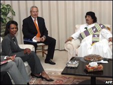 امریکی وزیر خارجہ کونڈولیزا رائس نے لیبیا کے سربراہ کرنل معمر قذافی سے ترپولی میں ملاقات کی ہے جس کے بعد انہوں نے کہا کہ دونوں ملکوں کے تعلقات ایک’ نئے دور‘ میں داخل ہوگئے ہیں۔ کرنل قذافی کی سرکاری رہائش گاہ باب العزیزیہ میں افطار کی دعوت میں شریک ہونے کے بعد محترمہ رائس نے کہا کہ ’ہمارے تعلقات کئی برسوں سے صحیح سمت میں بڑھ رہے تھے اور میرے خیال میں آج سےایک نئے دور کا آغاز ہوگا۔‘ انیس سو چھیاسی میں امریکی جنگی طیاروں نے باب العزیزیہ پر ہی بمباری کی تھی جس میں کرنل قذافی کی بیٹی ہلاک ہوگئی تھی۔ امریکہ کا دعوی تھا کہ یہ کارروائی جرمنی میں دہشت گردی کے ایک حملے کے جواب میں کی گئی تھی جس میں اس کے مطابق لیبیا کا ہاتھ تھا۔ محترمہ رائس نے کہا کہ ’میں پہلے بھی کہہ چکی ہوں کہ امریکہ کا کوئی مستقل دشمن نہیں ہوتا۔ ہم نے (کونڈولیزا رائس اور کرنل قذافی) ماضی کے تجربات سے سبق سیکھنے کی اور اب آگے بڑھنے کی اہمیت پر بات کی۔‘ اس سے پہلے انیس سو ترپن میں امریکی وزیر خارجہ لیبیا گئے تھے۔ لیبیا کے وزیر خارجہ عبدالرحمان نے کہا کہ ’لیبیا بدل گیا ہے، امریکہ بدل گیا ہے، دنیا بدل چکی ہے۔ اب ماضی کو بھول جانا چاہیے۔‘ امریکی وزیر خارجہ کا یہ دورہ ان کے شمالی افریقہ کے دورے کا حِصّہ ہے۔ وہ تیونس، الجیریا اور مراکش کا بھی دورہ کریں گی۔ بی بی سی کے نامہ نگار رانا جواد تریپولی سے بتاتے ہیں کہ چھ برس قبل اس قسم کے دورے کا گمان بھی نہیں کیا جا سکتا تھا۔ پیر کو ہی لیبیا نےان لوگوں کے لواحقین کے لیےمعاوضہ کے پیکج کو حتمی شکل دی تھی جو انیس سو اٹھاسی میں اس وقت ہلاک ہوگئے تھے جب لاکربی پر سے پرواز کے دوران ایک امریکی طیارے کو بم کے دھماکے سےاڑا دیا گیا تھا۔ اس حملے کی ذمہ داری لیبیا پر عائد کی گئی تھی۔ سابق امریکی صدر رونلڈ ریگن نے ایک مرتبہ معمر قذافی کو ’پاگل کتا‘ کہا تھا۔