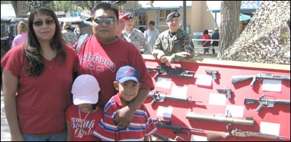 جب تک یہ تقریب چلتی رہی، گانا بجانا بند تھا، لیکن اس کے بعد موج مستی شروع ہوگئی۔ مجھے لگا کہ شاید یہ اچھا طریقہ ہے کہ ملک کے فوجیوں کو عوام کے سامنے عزت دینے کا۔ لیکن ابھی بہت کچھ دیکھنا باقی تھا۔ جیسے ہی میں آگے بڑھا تو کھلونوں، کپڑوں، کھیل تماشوں، ٹاکو اور میکسیکن کھانے کے اسٹالوں کے سامنے امریکی فوج کی مختلف یونٹوں کے اسٹال لگے ہوئے تھے، یو ایس مرینز، یو ایس نیوی، نیشنل گارڈز، ایئر فورس، وغیرہ۔ ان اسٹالوں پر چابی کے رِنگ اور آرم بینڈ جیسی چیزیں مفت دیکر بچوں اور نوجوانوں کو متوجہ کرنے کی کوشش کی جارہی تھی۔ ایک اسٹال پر تو ہر طرح کے جان لیوا ہتھیار سجائے ہوئے تھے، راکٹ لانچر، گرینیڈ لانچر، طرح طرح کی بندوقیں اور چھوٹے چھوٹے بچے انہیں چھوکر دیکھ رہے تھے اور فوجی افسر انہیں بتا رہے تھے کہ کون ہتھیار کتنا مار سکتا ہے۔ نئے خون کو کم عمر میں فوجی کی جانب متوجہ کرنے کے لیے اس سے بہتر کیا طریقہ ہوسکتا تھا۔ لیکن گڈے گڈیوں، ہاتھی گھوڑوں، ہی مین، سپرمین کے درمیان ان ہتھیاروں کو دیکھ کر تھوڑی حیرانی ضرور ہوئی۔ شان لانگسٹیڈ اپنے سات سالہ بیٹے کے ساتھ کھڑی تھیں۔ میں نے پوچھا کہ کیا انہیں یہ صحیح لگتا ہے۔