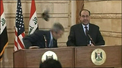 عراقی دارالحکومت بغداد میں اتوار کو وزیراعظم نوری المالکی کے ہمراہ ایک پریس کانفرنس کے دوران امریکی صدر جارج بش پر دو جوتے پھینکے گئے۔ پریس کانفرنس کے دوران ایک عراقی صحافی نے اپنے جوتے صدر بش پر پھینکے اور انہیں ’کتا‘ کہا۔ اس کے بعد سکیورٹی گارڈز اس صحافی کو قبضے میں لیکر پریس کانفرنس سے باہر لےگئے۔ اب صدر بش عراق سے افغانستان گئے ہیں جہاں وہ صدر حامد کرزئی سے مذاکرات کریں گے۔ صدر بش پر جوتے پھینکنے کا واقعہ پریس کانفرنس کے دوران پیش آیا جب عراقی ٹی وی کے صحافی نے صدر بش پر اپنا جوتا پھینکتے ہوئےکہا: ’کتے، عراقی عوام کی جانب سے الوداع۔‘ تاہم جوتا صدر بش کو نہیں لگا۔