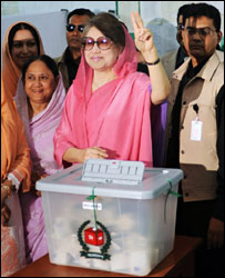 دو سال کی ایمرجنسی کے بعد بنگلہ دیش میں ہوئے انتخابات میں سنہ تہتر کے بعد پہلی مرتبہ ایسا ہوا ہے کہ ایک جماعت کو واضح اکثریت حاصل ہوئی ہے۔ ان انتخابات میں ڈالے گئے ووٹوں کی شرح زیادہ تھی اور پرتشدد واقعات بھی کم ہوئے۔ ان انتخابات میں سابق وزیر اعظم شیخ حسینہ کی جماعت عوامی لیگ اور اس کے اتحادی کی جیت ہوئی جس میں انہوں نے قومی اسمبلی کی دو تہائی نشستیں جیتیں۔ مہوجت یعنی اس اتحاد نے مخالفین بنگلہ دیش نیشنلسٹ پارٹی (بی این پی) اور جماعت اسلامی کو بری طرح شکست دی۔ جماعت اسلامی کی تمام امیدواروں کو شکست کا سامنا کرنا پڑا۔ عوامی لیگ کی فتح نے عوام کے ساتھ ساتھ اس جماعت کے قائدین بھی اس جیت کے بارے میں سوچ بچار کر رہے ہیں۔ عوامی لیگ کے عبدل مہتھ نے بی بی سی بنگالی سروس سے بات کرتے ہوئے کہا ’ہمیں معلوم تھا کہ ہم جیتیں گے لیکن اتنی واضح اکثریت سے جیتنے کی امید نہ تھی۔ یہ ہمارے لیے بہت بڑا چیلنج ہے اور ہمیں لوگوں کی امیدوں پر پورا اترنا ہو گا۔‘ عبدل مہتھ کا نام وزیر خزانہ کے طور پر سامنے آ رہا ہے۔ انتخابات کے نتائج کے ساتھ سیاسی تجزیہ کار یہ سمجھنے کی کوشش کرتے رہے کہ بی این پی کی ہار کی کیا وجوہات ہو سکتی ہیں۔ ڈیلی سٹار اخبار کے مدیر محفوظ انم کا کہنا ہے ’یہ نتائج واضح طور پر عوام کی آواز کا نتیجہ ہیں۔ پہلی بار مجموعی ووٹرز میں سے ایک تہائی نے ووٹ ڈالے اور نوجوان ووٹرز نے بی این پی کی منفی سیاست کو مسترد کیا جو کہ مذہب اور خوف پر مبنی تھی‘۔ لیکن لوگوں کا بی این پی کو مسترد کرنا ہی ان نتائج کی وجہ نہیں ہے۔ عوامی لیگ کے بارے میں اکثر کہا جاتا ہے کہ اس کی سوچ پرانی ہے۔ لیکن اس مرتبہ اس نے اپنی نئی مہم سے بہت سے لوگوں کو حیرت میں ڈال دیا۔ سماکل کے نائب مدیر مزمل حسین کا اس بارے میں کہنا تھا ’اسی کی دہائی میں عوامی لیگ کے بارے میں کہا جاتا تھا کہ یہ ماضی کی بات کرنے والی جماعت ہے۔ لیکن اس جماعت کے منشور نے نوجوان ووٹرز کو اپنی طرف کھینچا۔‘ یہ کم و بیش ہوتا ہے کہ سیاستدان نوجوانوں کو مستقبل کے حوالے سے تصور دیا ہو لیکن سینیئر صحافی امان اللہ کبیر کا کہنا ہے کہ عوامی لیگ نے اس بار وہ تصور دیا ہے۔ ’شیخ حسینہ نے ڈیجیٹل بنگلہ دیش بنانے کی آواز لگائی، معاشی ترقی پروگرام دیا اور اس نے نوجوانوں کو امید دی اور انہوں نے اس امید کو ووٹ دیے۔‘ اس طرح کی واضح جیت سے جماعت کے لوگ تو خوش ہوتے ہیں لیکن غیر جانبدار لوگ کو ہمیشہ تھوڑا خوف رہتا ہے۔ ان کا کہنا ہے کہ سنہ دو ہزار ایک میں بی این پی بھی دو تہائی اکثریت سے جیتی تھی اور ملک کی تاریخ میں سب سے بدعنوان حکومت بنی۔ لیکن عوامی پارٹی کا کہنا ہے کہ وہ ایسی غلطی نہیں کرے گی۔ ’شیخ حسینہ کے قریبی ساتھی حسن محمود کا کہنا ہے ’ہمیں بڑی فتح نصیب ہوئی ہے لیکن حزب اختلاف کی کم نشستیں ہونے کے باوجود ہماری کوشش ہو گی کہ ان کو پالیسی بنانے میں شامل رکھیں۔‘