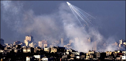 پندرہ دن کی مسلسل بمباری کے بعد جس میں آٹھ سو سے زیادہ افراد ہلاک ہو گئے ہیں اسرائیل نے غزہ پر پرچیاں گرائی ہیں جن میں غزہ کے لوگوں کو فوجی کارروائی مزید تیز کرنے کے بارے میں خبردار کیا گیا ہے۔ اسرائیل کی طرف سے پرچیوں کے علاوہ لوگوں کو فون کے ذریعے بھی یہ پیغامات موصول ہوئے جن کے بعد یہ قیاس آرائیاں کی جا رہی ہیں کہ اسرائیل اس لڑائی میں نئے حربے اختیار کرنے والا ہے۔ ہفتے کو اسرائیل نے ایک درجن سے زائد حماس سے متعلق عمارتوں کو نشانہ بنایا جن میں مبینہ طور پر راکٹ داغنے کے اڈے، ہتھیاروں کے ذخیرے اور سمگلنگ کی سرنگیں شامل تھی۔ غزہ میں طبی عملے کا کہنا ہے کہ آٹھ سو فلسطینی اب تک ہلاک ہو چکے ہیں۔ جبکہ دوسری طرف تیرہ اسرائیل ہلاک ہوئے ہیں۔ غزہ پر فضا سے پھینکی جانے والی پرچیوں اور فون کے ذریعے دیئے جانے والے پیغاموں میں عربی زبان استعمال کی گئی اور غزہ کے لوگوں کو خبردار کیا گیا ہے کہ وہ حماس کی عمارتوں کے قریب نہ جائیں۔ ان میں مزید کہا گیا ہے کہ اسرائیلی فوجی غزہ کے لوگوں کو نشانہ نہیں بنا رہے بلکہ وہ حماس کے خلاف کارروائی کر رہے ہیں۔ فون کے ذریعے موصول ہونے والے ایک پیغام میں کہا گیا کہ فوجی کارروائی تیسرے مرحلے میں جلد داخل ہو جائے گی۔ نامہ نگاروں کا کہنا ہے کہ تیسرے مرحلے ممیں اسرائیل کی فوج غزہ میں آبادی والے علاقوں اور مہاجرین کیمپوں میں داخل ہونے کا سوچ رہی ہے جس میں شہریوں اور اسرائیل فوج کے جانی نقصان کا خطرہ بڑھ جائے گا۔ فلسطینی طبی ذرائع کا کہنا ہے کہ ہفتے کو تشدد کے بدترین واقعہ میں آٹھ افراد جن کے بارے میں خیال کیا جاتا ہے کہ عام شہری تھے اسرائیل فوج کے ایک ٹینک کا شیل لگنے سے ہلاک ہو گئے۔ غزہ میں بی بی سی کے نامہ نگار حمزا ابو قمر نے اطلاع دی ہے کہ ریڈ کراس کے کارکنوں نے تیرہ خواتین اور بچوں کو غزہ کے شمالی علاقوں سے نکالا ہے جب کہ اسرائیل فوج نے انہیں وہ سے لاشیں اُٹھانے سے روک دیا۔ اسرائیل کا کہنا ہے کہ اس نے ہفتے کو ستر سے زیادہ فضائی، زمینی اور بحری حملے کیئے۔ ایک اسرائیل فوجی ترجمان نے کہا کہ ہلاک ہونے والوں میں حماس کے ایک سینئر اہلکار امیر منسی بھی شامل ہیں جو کہ اسرائیل پر راکٹ حملوں میں ملوث رہے ہیں۔