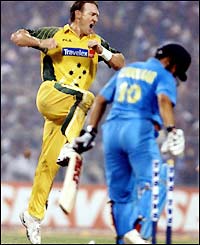 بھارت کے شہر کلکتہ میں بھارت اور آسٹریلیا کے مابین ایک روزہ میچوں کی سہ فریقی سیریز ٹی وی ایس کپ کے فائنل میں آسٹریلیا نے بھارت کو سینتیس رن سے شکست دے دی ہے۔ بھارت کو جیت کے لئے دو سو چھتیس رن بنانے تھے لیکن سچِن تندولکر کے جلد آؤٹ ہونے کے بعد کسی بھی بیٹسمین نے کریز پر جم کر کھیلنے کی کوشش نہیں کی۔ سچن اور راہول ڈراوڈ کے علاوہ بھارتی بیٹسمین پارٹنرشپز بنانے میں ناکام رہے اور میچ بیالیسویں اوور میں ہی ختم ہوگیا۔ آسٹریلیا کی طرف سے ہاروی نے چار اور کلارک نے دو وکٹیں حاصل کیں۔ بھارت کی طرف سے ڈراوڈ نے اننچاس اور سچن نے پینتالیس رن بنائے، جب تک یہ دونوں کریز پر تھے تو ایسا ظاہر ہو رہا تھا کہ بھارت کو دو سو پینتیس رن عبور کرنے میں کسی بڑی مشکل کا سامنا نہیں ہوگا۔ لیکن حسب معمول سچِن کے آؤٹ ہوتے ہی بھارتی اننگز ایسی لڑ کھڑائی کہ پھر سنبھل ہی نہیں پائی۔ بھارت نے اپنی آخری چھ وکٹیں صرف سات اوورز میں کھو دیں۔ اس سے سے قبل آسٹریلیا نے پچاس اوورز میں پانچ کھلاڑیوں کے نقصان پر دو سو پنتیس رنز بنائے۔ آُسٹریلیا نے ٹاس جیت کر پہلے بیٹنگ کا فیصلہ کیا تھا۔ ڈیمین مارٹن نے سب سے زیادہ سکور اکسٹھ رنز بنائے۔ تاہم نوجوان کھلاڑی مائیکل بیون نے زبردست بیٹنگ کا مظاہرہ کیا اور اٹھائیس گیندوں میں چوالیس رنز بنائے۔ اس سے قبل حیدرآباد میں کھیلے جانے والے سیمی فائنل میں بھارت نے سچن تیندولکر اور سیہواگ کی سینچریو ں کی مدد سے نیوزی لینڈ کو ایک سو پینتالیس رن سے شکست دی تھی۔ بھارتی ٹیم کے کپتان سورو گنگولی ان فٹ ہونے کے باعث فائنل میں شریک نہیں ہوسکے ہیں۔ سیمی فائنل میں بھارت کے تین سو تریپن رن کے جواب میں نیوزی لینڈ کی پوری ٹیم صرف دو سو آٹھ رن بناکر سینتالیس اوور میں آؤٹ ہوگئی تھی۔ یاد رہے اس میچ میں بھارت نے ٹاس جیت کر پہلے بیٹنگ کی تھی۔ ہندوستان اس سیریز میں تین میچ ہار چکا ہے اور گزشتہ بدھ کو ہونے والے میچ میں آسٹریلیا نے اس کے خلاف 347 رنز بنائے تھے۔ بھارتی ٹیم اگلے ماہ آسٹریلیا کا دورہ کررہی ہے جس کے دوران چار ٹیسٹ میچ کھیلے جائیں گے۔ ان ٹیسٹ میچز کا آغاز چار دسمبر سے ہوگا۔ |