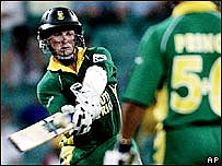 جنوبی افریقہ کی ٹیم اہم بالر شان پولاک کے بغیر کھیل رہی تھی۔ جنوبی افریقہ کو 344 رنز کےہدف کےتعاقب میں ابتداء ہی میں نقصان اٹھاناپڑا جب گراہم اسمتھ کا کیچ بریٹ لی کی گیند پر ایڈم گلکرسٹ نے پکڑا۔اس وقت جنوبی افریقہ کا سکور سات تھا۔ گبسن اور باؤچر نے تیسری وکٹ کی شراکت میں 53 رنز کا اضافہ کیا لیکن یہ دونوں کھلاڑی سمنڈز کی باؤلنگ کا نشانہ بنے۔ اس کے بعد جنوبی افریقہ کا کوئی بھی بلےباز آسٹریلوی باؤلنگ کامقابلہ نہیں کرسکا اور پوری ٹیم مقررہ پچاس اوورز میں چھ وکٹوں کے نقصان پر صرف 287رنز ہی بناسکی۔ آسٹریلیا کے فاسٹ بالر بریٹ لی اور ہوج نے ایک ایک جبکہ سمنڈز نے دو وکٹیں حاصل کیں۔ سیریز کے اگلے میچز میں سات فروری کو سری لنکا کا مقابلہ جنوبی افریقہ سے ہوگا۔ | اسی بارے میں آسٹریلیا 258 پر آؤٹ16 December, 2005 | کھیل آسٹریلیا مضبوط پوزیشن میں18 December, 2005 | کھیل آسٹریلیا کی 184 رنز سے فتح30 December, 2005 | کھیل جنوبی افریقہ نے آسٹریلیا کو ہرا دیا15 January, 2006 | کھیل آسٹریلیا نےسری لنکا کوہرا دیا26 January, 2006 | کھیل آسٹریلیا کی ایک اور کامیابی03 February, 2006 | کھیل | ||||||||||||||||||||||||||||||||||||||||