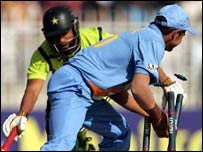 پاکستان کی طرف سے پشاور میں سیریز کے پہلے میچ میں سنچری بنانے والے سلمان بٹ اس میچ میں پہلے ہی اوور میں صفر پر آؤٹ ہوئے۔ دوسرے آؤٹ ہونے والے کھلاڑی کامران اکمل تھے جو نویں اوور میں چودہ رنز پر پویلین لوٹے۔ دونوں اوپنروں کو عرفان پٹھان نے آؤٹ کیا۔ دسویں اوور میں محمد یوسف ایک رن پر آؤٹ ہوگئے اور چودھویں اوور میں انضمام آٹھ رنز پر آؤٹ ہوئے۔ پاکستانی ٹیم میں اس میچ کے لیے کوئی تبدیلی نہیں کی گئی۔ بھارتی ٹیم میں مرلی کارتک کی جگہ سریش رائنا کو شامل کیا گیا جبکہ رمیش پوار سپر سب ہیں۔ سیریز کا تیسرا ون ڈے انٹرنیشنل پیر کو لاہور میں کھیلا جائے گا۔ پاکستانی ٹیم ان کھلاڑیوں پر مشتمل ہے: انضمام الحق ( کپتان)۔ سلمان بٹ۔ کامران اکمل۔ شعیب ملک۔محمد یوسف۔ شاہد آفریدی۔ عبدالرزاق۔ یونس خان۔ رانا نویدالحسن ۔عمر گل اور محمد آصف۔ سپرسب ارشدخان ہیں۔ بھارتی ٹیم: راہول ڈراوڈ ( کپتان)۔ وریندر سہواگ۔ سچن تندولکر۔ عرفان پٹھان۔ مہندرا دھونی۔ یوراج سنگھ۔ محمد کیف۔ اجیت اگرکار۔ ظہیرخان۔ سری سانتھ اور سریش رائنا شامل ہیں۔ امپائرز سائمن ٹافل اور اسد رؤف جبکہ میچ ریفری کرس براڈ ہیں۔ | اسی بارے میں ’ٹیم کو پریشر میں کھیلنا آگیا‘ 10 February, 2006 | کھیل شعیب اختر پھر ان فٹ ہوگئے10 February, 2006 | کھیل ’انضمام کے خلاف اپیل ٹھیک تھی‘09 February, 2006 | کھیل پشاور: ’میچز کروائے جائیں‘06 February, 2006 | کھیل ون ڈے سیریز کا چیلنج، تیاری مکمل05 February, 2006 | کھیل | ||||||||||||||||||||||||||||||||||||||||
