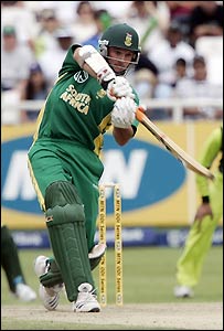 ان کے آؤٹ ہونے کے کچھ ہی دیر بعد ژاک کیلس نے عبدالرزاق کو آؤٹ کر دیا جبکہ اظہر محمود کو کیمپ نے وکٹ کیپر کے ہاتھوں کیچ کروا دیا۔ اس کے بعد نتینی کی گیند پر رانا نوید کا کیچ باؤچر نے لیا وہ تین رنز ہی بنا سکے۔ عبدالرحمن بھی کوئی رن نہ بنا سکے اور لینگیویلٹ کی گیند پر ان کا کیچ وکٹ کیپر نے مارک باؤچر نے لیا۔ پاکستان کے آخری آؤٹ ہونے والے کھلاڑی محمد آصف تھے جو بغیر کوئی رن بنائے اینڈریو ہال کی گیند پر بولڈ ہوگئے۔ جنوبی افریقہ کے کپتان گریم سمتھ نے ٹاس جیت کر پاکستان کو پہلے کھیلنے کی دعوت دی تھی۔ پاکستانی ٹیم: جنوبی افریقہ کی ٹیم: | اسی بارے میں پورٹ الزبتھ میں بارش، میچ کالعدم09 February, 2007 | کھیل آفریدی پر چار ون ڈے کی پابندی10 February, 2007 | کھیل راؤ افتخار بھی جنوبی افریقہ جائیں گے06 February, 2007 | کھیل سنچورین: جنوبی افریقہ کی جیت04 February, 2007 | نیٹ سائنس | ||||||||||||||||||||||||||||||||||||||||