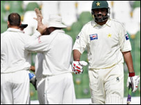 پاکستان کی مشکلات میں بے حد اضافہ اس وقت ہوا جب مصباح الحق جو کہ کافی سیٹ ہو چکے تھے ایک غیر ذمہ دارانہ شارٹ کھیلتے ہوئے باؤچر کے ہاتھوں مکھایا نتینی کے گیند پر آؤٹ ہو گئے۔ اس وقت پاکستان کا سکور 189 تھا۔ مکھایا نے اپنی اگلی بال پر عمر گل کو ایل بی ڈبلیو آؤٹ کر دیا اور ہیٹ ٹرک کے قریب پہنچ گئے لیکن وہ ہیٹ ٹرک تو نہ بنا سکے البتہ انہوں نے 189 رنز پر ہی اگلے بیٹس مین دنیش کنیریا کوبھی آؤٹ کر دیا۔ ان کا کیچ بھی وکٹ کیپر مارک باؤچر نے لیا۔ دنیش کوئی رن نہ بنا سکے۔ لنچ کے وقفے پر پاکستان کی نو وکٹیں گر چکی تھیں۔ دنیش کے بعد محمد آصف کھیلنے کے لیے آئے۔ محمد آصف نے عبدالرحمن کا کچھ دیر ساتھ دیا لیکن وہ بھی لنچ کے بعد پہلے اوور کی آخری گیند پر آملہ کے ہاتھوں پال ہیرس کی گیند پر کیچ آؤٹ ہوئے اور یوں پاکستان کی پوری ٹیم 63 اوورز میں 287 منٹ وکٹ پر گزار کر 206 رنز بنا کر پیولین لوٹ گئی۔ جنوبی افریقہ کی جانب سے مکھایا نتینی نے تین، ہیرس نے تین، سٹین نے دو اور نیل اور کیلس نے ایک ایک وکٹ لی۔ جنوبی افریقہ کی دوسری اننگز کا آغاز بھی حسب معمول گریم سمتھ اور ہرشل گبز نے کیا۔ ان کی پہلی وکٹ 34 کے سکور پر گری جب گبز سولہ رنز بنا کر عمر گل کی گیند پر کامران اکمل کے ہاتھوں کیچ آؤٹ ہوئے۔ جنوبی افریقہ کی دوسری وکٹ چائے کے وقفے سے کچھ لمحے پہلے چھیاسٹھ رنز پر گری۔ہاشم آملہ سترہ رنز پر کھیل رہے تھے کہ عبدالرحمن نے انہیں بولڈ کر دیا۔ پاکستان ٹیم جنوبی افریقن ٹیم | اسی بارے میں دوسرا دن، پاکستان 140 پر چار آؤٹ09 October, 2007 | کھیل سیریز برابر کریں گے:شعیب07 October, 2007 | کھیل انضمام ! ہم خوش قسمت ہیں05 October, 2007 | کھیل انضمام ٹیسٹ کرکٹ سے ریٹائر05 October, 2007 | کھیل ’انضمام کیلیےخاص حکمتِ عملی درکار‘09 October, 2007 | کھیل یہ جیت معنی رکھتی ہے: سمتھ05 October, 2007 | کھیل کراچی ٹیسٹ میں جنوبی افریقہ فاتح05 October, 2007 | کھیل | ||||||||||||||||||||||||||||||||||||||||