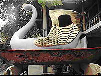 Anh sơn và vẽ lại con thiên nga này theo cách tô sơn mài truyền thống, với những hoạ tiết như ở đình chùa, rồi đặt lên trên một chiếc kiệu gỗ cổ. Anh đặt tên cho thiên nga là: "Ngôi đền của tình yêu". Kế bên ngôi chùa, anh đặt một màn hình TV, chiếu một đoạn video do anh quay, cảnh đôi tình nhân bên nhau say đắm trên con thiên nga đạp nước tại hồ Trúc Bạch. Còn Trương Tân thì với tài nghệ may vá, anh làm một bức điêu khắc bằng vải. Ðó là một chiếc Bỉm thay cho tã lót trước kia của các em bé nhưng được phóng với tỷ lệ 1:10 nghĩa là gấp 10 lần kích thước thật. Khi lại gần thì thấy phía trong của chiếc Bỉm được lát bằng một lớp túi áo ngực (138 cái) ngay ngắn và đều đặn. Nhìn cái túi áo ngực là nhớ ngay ra hình ảnh cái áo mà người ta quen gọi ngày trước là áo đại cán. Khi tôi đến xưởng, nơi anh làm việc, anh cho tôi xem cái áo công an cũ mà anh đã mua ở đường Lê Duẩn, cạnh ga Hàng Cỏ. Tôi tự kiểm duyệt Những cái túi áo này chính là thủ phạm gây nên việc công an đến và không cho trưng bày, cho dù đã xin được giấy phép từ Vụ Mỹ thuật. Nghe đồn rằng, công an nói đó là hình ảnh túi áo của tấm áo mà chính Chủ tịch Hồ Chí Minh ngày xưa từng mặc. Thì đây tôi cũng chỉ nói lại theo dạng tin đồn, chứ không biết có thực thế hay không và chúng ta cũng chỉ hiểu nó ở dạng tin đồn. Nhưng những túi áo ngực mà Trương Tân dùng làm lớp đệm phía trong của chiếc Bỉm phóng đại này, với riêng tôi thì đúng là giống hệt như ở cái áo mà Chủ tịch Hồ Chí Minh mặc trong nhiều bức ảnh. Theo như tôi tự kiểm duyệt, thì tác phẩm "Ngôi đền tình yêu" của Nguyễn Quang Huy chẳng có vấn đề gì là phê bình nhà nước, hay khiêu dâm, hay bạo lực, để bị kiểm duyệt. Thế mà cũng bị dẹp luôn. Nguyễn Quang Huy nói: “Tôi cảm thấy như bị đàn áp, vì sáng tạo của mình không được triển lãm. Một tác phẩm tôn thờ tình yêu mà cũng bị cấm, tôi không thể hiểu nổi”. Người Ðức mời hai nghệ sĩ Việt Nam triển lãm cùng 29 nghệ sĩ Ðức tại Việt Nam, thế mà hai người Việt Nam không được triển lãm. Thế mới đen.