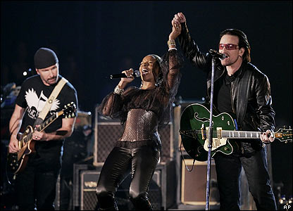 Ban nhạc U2 nhận được nhiều giải Grammy nhất năm nay. Trên ảnh U2 cùng Mary J Blige hát bài One.