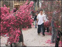 Không chỉ hi vọng như giám đốc công ty hoa Anh Trí, anh A Ngân, chủ vườn lan Trường Xuân, người gốc Trung Quốc đã kinh doanh hoa ở Việt Nam được 3 năm nay thì khẳng định: “Mỗi năm, lượng tiêu thụ hoa ở Việt Nam năm sau đều gấp đôi so với năm trước. Hoa là sức sống của nền kinh tế. Năm nay, kinh tế Việt Nam rất phát triển, chắc chắn việc kinh doanh hoa cũng sẽ thuận lợi.” Chơi hoa, chơi cây Dọc theo con dốc dẫn vào Phủ Tây Hồ, chúng tôi gặp nhiều nhà vườn, với đủ loại hoa trái…Mấy năm nay, cuộc sống của những người làm vườn đất Nghi Tàm, Quảng Bá “khấm khá” hẳn lên, khi nhiều gia đình xây nhà, xây cửa đều chú ý đến thuật “phong thuỷ” bằng cách trồng thêm các loại cây quanh nhà. Và để thu hút khách trong thời buổi kinh tế thị trường cạnh tranh gay gắt, các nhà vườn cũng phải tìm tòi những giống cây mới, và tự làm ra “hàng độc”. Chị Phương, chủ vườn cây Phương Trung rất nhiệt tình giới thiệu với ông khách quen là “bác sỹ phòng mạch” tư nhân mấy gốc bưởi cảnh, trên một cây nhỏ mà ghép được hai loại bưởi đào và bưởi diễn. Chị khẳng định, chơi cam canh năm nay sẽ không còn “sành điệu” nữa rồi. Ngay lập tức, chị đã thuyết phục được ông bác sỹ đặt tiền mua hai gốc bưởi với giá 5 triệu/cây để đặt trong sân vườn biệt thự. Bà Linh, chủ vườn hoa Linh Lợi, nhà vườn duy nhất ở đường phủ Tây Hồ không hề có biển hiệu đã chỉ cho tôi cách đoán biết tính cách của một con người qua cách người ấy chọn hoa. Có người chọn hoa theo sở thích, có người chơi hoa theo phong trào, có người mua hoa vì mê tín. Nhiều người lại mua hoa bằng tai chứ không phải mua bằng mắt, thích vì nghe tên gọi: nào là cành vàng lá ngọc, hoàng đế đại vương, hoàng gia, đại gia, kim tiền á bạc… Bà Linh tâm sự: “Hoa hồng nếu được gọi bằng một cái tên khác thì nó vẫn toả hương. Chính vì vậy, không có cây gì quý và cây nào là không quý, cốt là người chơi phải biết đặt đúng vị trí thì nó mới đẹp. Cũng giống như con người, nếu được đặt đúng vị trí thì họ mới có thể phát huy hết sở trường của mình.” Vừa là người làm vườn, cũng là người chơi hoa, bà Linh vẫn giữ theo lối cổ. Theo trào lưu xã hội bây giờ, lớp trẻ thường chuộng hoa ly, hoa rum và các loại hoa ngoại nhập. Nhưng ngày xưa, trên bàn nước, một lọ hoa phải có đủ năm mầu, tượng trưng cho ngũ hành, gồm có thược dược, viôlét, và ba cành dơn đỏ, còn hai bên bàn thờ là hoa hải đường hoặc cành đào phai. Theo bà Linh, đó là những loài hoa mà chỉ đến mùa xuân mới có. Miền Bắc khác với miền Nam vì có bốn mùa rõ rệt. Vì vậy, người Hà Nội cũng được hưởng thụ những gì tinh tuý nhất của thiên nhiên, bốn mùa: Xuân- Hạ, Thu- Đông. Bởi vậy mà ngày Tết cổ truyền, không có lý gì người Việt Nam lại không biết sử dụng những loài hoa tinh tuý nhất mà mùa Xuân dâng tặng. | ||||||||||||||||||||||||||||||||||||||||||||||||||||||||||||||||||||||||||||||||