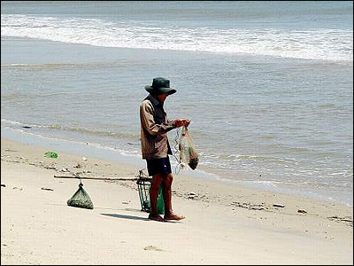 Trên bãi biển Nhật Lệ, Quảng Bình người đàn ông này mò bắt con cua con cá nhưng kiếm suốt cả ngày bán được chưa tới 20 ngàn đồng. (Ảnh Trần Dân Việt, TP HCM.)