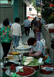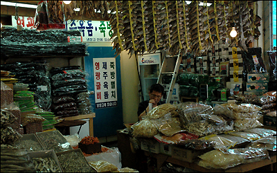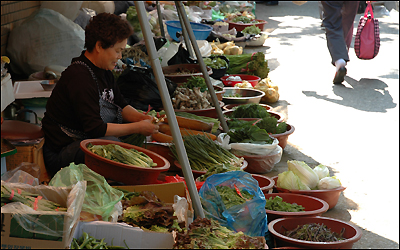Hàn quốc có những chợ chòm hỏm giống hệt Việt Nam. Một bà bán hàng tranh thủ ngồi bóc gốc những cây hành lá cho vừa mắt khách hàng.