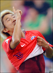 Chun Soo Lee vui mừng sau khi đá cầu vồng từ bên vòng cấm địa chọc thủng lưới Topgo.