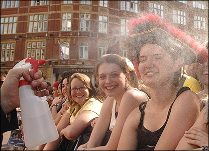 Người hâm mộ được xịt nước để thoáng mát trong một ngày nóng khủng khiếp