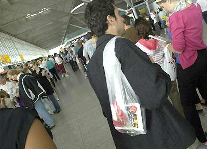 Nhiều giờ sau khi có báo động an ninh, Cục hàng không dân dụng phát các túi sạch cho các hành lý xách tay được phép mang theo hạn chế. (Ảnh của Phil Coomes/BBC)