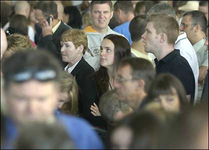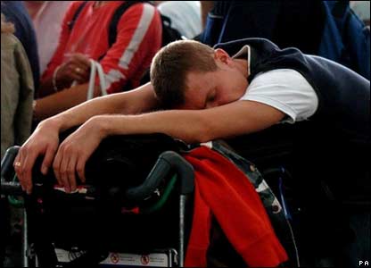 Các hành khách lo lắng theo dõi bảng chỉ dẫn chuyến bay để tìm kiếm thêm thông tin. (Ảnh của (Phil Coomes/BBC)
