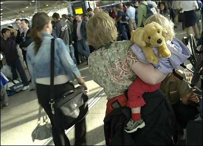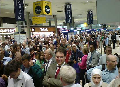Lúc 8 giờ sáng, các hàng người chen chúc qua sân ga trong khi mọi người đợi làm thủ tục bay và an ninh. (Ảnh của Ashley Highfield/BBC)
