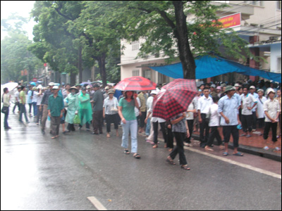 Cảnh những người nông dân mất đất từ các vùng quê đứng trước văn phòng Quốc hội ở Hà Nội đang diễn ra đến ngày thứ hai (30-8). Hôm trước đó, khoảng 300 người dân từ Hưng Yên đã tụ họp đòi chính phủ trung ương can thiệp điều mà họ nói mức đền bù đất quá thấp