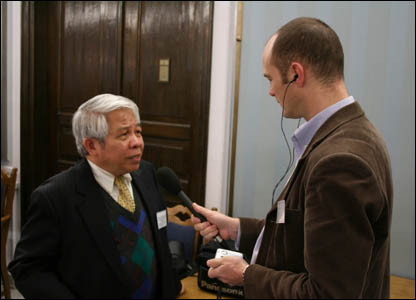 Giáo sư Nguyễn Ngọc Bích từ Hoa Kỳ trả lời phỏng vấn của Adam Easton, phóng viên thường trú của BBC News ở Warsaw.