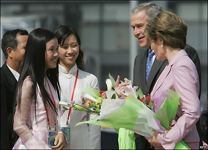 Chiếc Air Force One chở Tổng thống Bush và Đệ nhất phu nhân Laura đáp xuống sân bay Nội Bài lúc 1030 sáng nay 17/11.