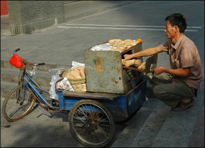 Nhưng cũng có người vất vả kiếm từng đồng như anh nông dân này, ngày ngày đạp chiếc xe cải biên bán khoai lang trên đường phố Quảng Châu bên cạnh dòng người, dòng xe ôtô tấp nập bận rộn với tiến độ chóng mặt của kinh tế thị trường.