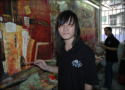 Lỗ Siêu Sinh, học tới lớp 9 thì nghỉ vào tập vẽ được 4 năm nay, bây giờ có thể hoàn tất 10 tranh mỗi ngày, "Thường chúng em vẽ tranh người ta đặt trước và với số lượng lớn."