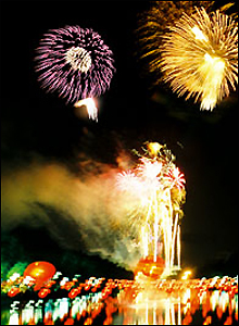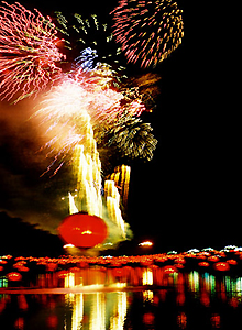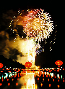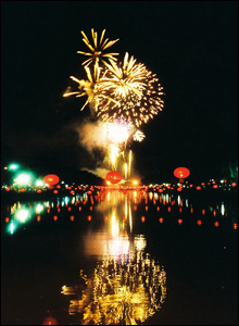 Lung linh pháo hoa phát sáng soi mình lung trong ánh nước.