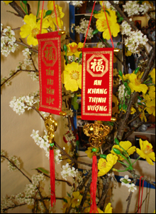 Trang trí cho ngày Xuân chùa chỉ có một cành hoa trắng nơi xứ lạnh, được tô thắm thêm nhờ những cánh mai lụa vàng , cùng những cánh thiệp Xuân đỏ thắm lời ước nguyện. Quyện thêm khói trầm hương, thế là nơi đây có chút không gian của quê hương.