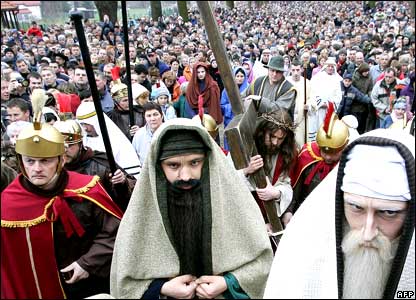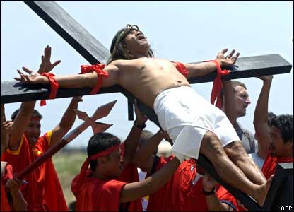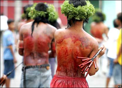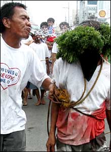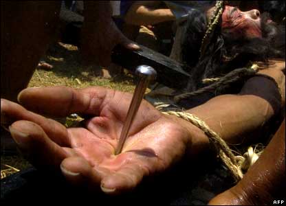 Tại Philippines, đoạn đường dẫn tới cây thập tự được tái hiện với cảnh một người đóng vai lính La Mã nhổ nước bọt lên một kẻ sám hối.