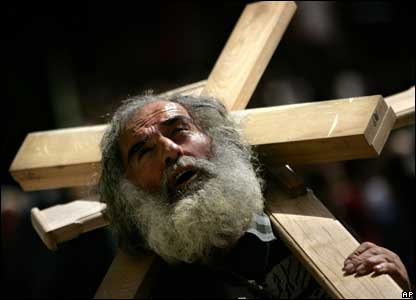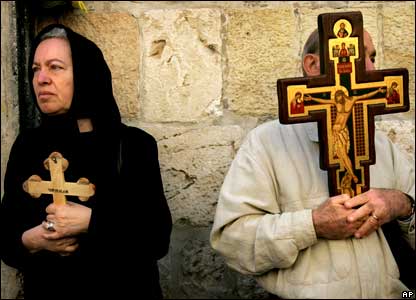 Tại nhà thờ Holy Sepulchre ở Jerusalem - được coi là nơi đã diễn ra lễ đóng đinh câu rút và chôn cất chúa Jesus, các tín đồ mang theo cây thập ác.