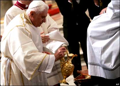Đức Giáo Hoàng Benedict XVI rửa chân cho 12 người, đại diện cho 12 vị tông đồ của Chúa Jesus, tại Rome hôm Thứ Năm.
