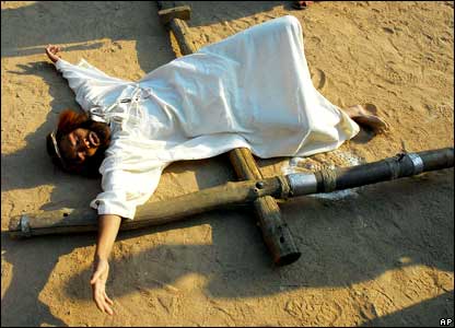 Trong một lễ tái hiện lặng lẽ hơn, một tín đồ Ấn Độ nằm trên cây thập tự tại Hyderabad.