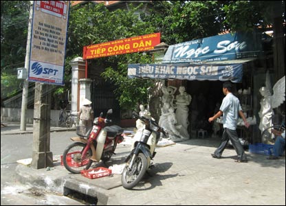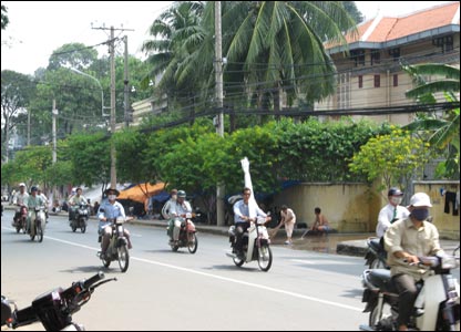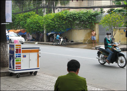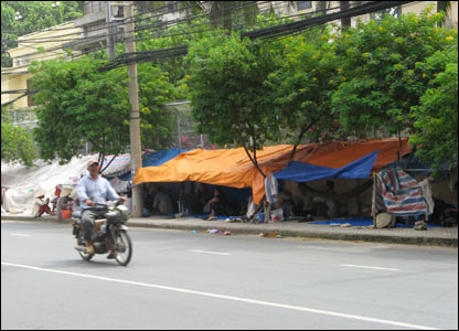 Ảnh chụp trên đường Võ Thị Sáu, một khu phố trông có vẻ rất yên bình, người dân qua lại. Nhưng thấp thoáng xa xa là các túp lều che tạm của những người đi khiếu kiện biểu tình.