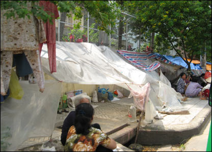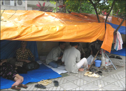 "Cả năm nay rồi, tụi tui ăn vỉa hè, ngủ vỉa hè, toilet cũng vỉa hè. Biết sao giờ, chờ hoài không được xử kiện, 'cho chìm xuồng' hết, nên đành lên đây nằm liều biểu tình thôi". Mọi người chen chúc nhau trong một túp lều không đủ che mưa mà cũng không chừa che nắng. Trông thương lắm, bà con ơi!