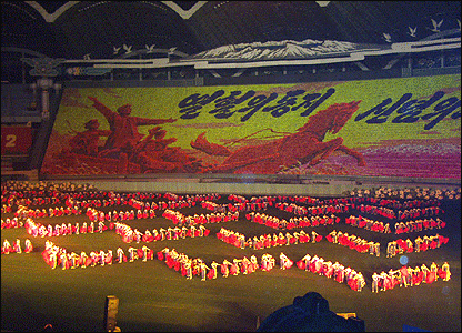 Người dân Bình Nhưỡng hân hoan thưởng thức. Những màn xếp hình tập thể là một trong những niềm tự hào quốc gia. Bắc Hàn tin rằng họ giỏi nhất thế giới trong môn này. Họ tin rằng nó thể hiện được mục tiêu thống nhất đất nước, khả năng kiềm chế nhu cầu cá nhân vì lợi ích của cả xã hội của người Bắc Hàn. | CÁC BÀI LIÊN QUAN Thăm khu phi quân sự19 Tháng 4, 2007 | Á Châu Nhật ký Bắc Triều Tiên17 Tháng 4, 2007 | Á Châu | ||||||||||||||||||||||||||||||||||||||||||||||||||||||||||||||||||||||||||||