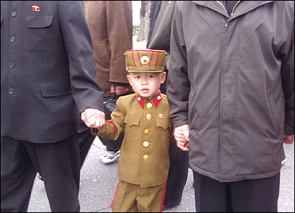 Một ngày đi chơi trong dịp lễ lớn nhất Bắc Hàn. Cảnh cha mẹ cho con cái mặc đồ lính không phải là hiếm. Quân đội được đề cao trong các chương trình tuyên truyền chính thức như một lực lượng bảo vệ cách mạng và là người chiến thắng trong các cuộc chiến chống lại Nhật và Mỹ.