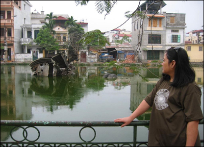 Còn đây là xác chiếc máy bay thả bom B52 của không lực Hoa Kỳ bị bắn rơi xuống một hồ nhỏ trong lòng thành phố Hà Nội 35 năm trước. Dường như thanh niên Hà Nội giờ đây không còn mấy ai quan tâm và đến thăm di tích này. Cùng đến với chúng tôi hôm nay, chỉ có rải rác vài ba du khách ngoại quốc trẻ tuổi nói giọng Mỹ, và có lẽ mỗi người mang một tâm trạng khác nhau.