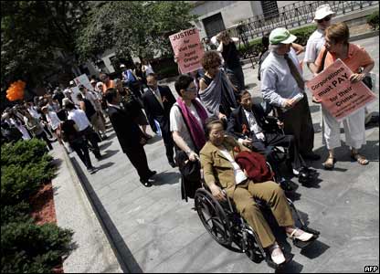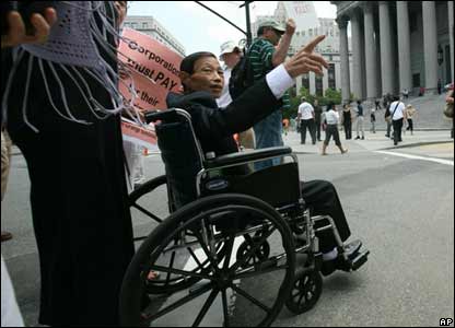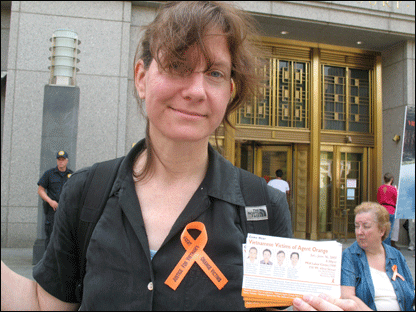 Đoàn các nạn nhân chất da cam và những người ủng hộ Việt Nam đứng bên ngoài tòa án ở New York ngày thứ Hai. Đã diễn ra phiên điều trần về việc sử dụng chất dioxin của quân đội Mỹ trong chiến tranh Việt Nam.