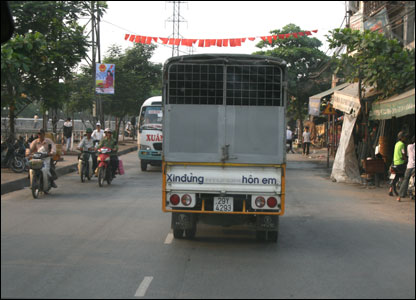 Kinh tế phát triển cũng kéo theo người sống ngoài tỉnh vào thành phố làm việc nhiều. Tai nạn giao thông xảy ra thường ngày. Chiếc xe tải mini này có vẻ vẫn muốn "đùa" với người tham gia giao thông khi ghi mấy dòng sau xe tưởng như vậy là "hóm hỉnh" .
