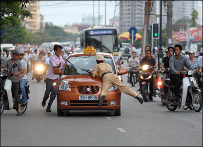 Báo trong nước gần đây đăng tấm hình của một người dân (lấy nick là Zora và đưa ảnh lên mạng) đi đường tình cờ chụp được cảnh công an giao thông chặn một taxi vượt đèn đỏ và bị đẩy đi khoảng vài chục thước. | |||||||||||||||||||||||||||||||||||||||||||||||||||||||||||||||||||||||||||||