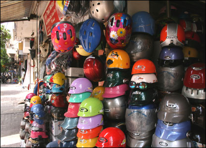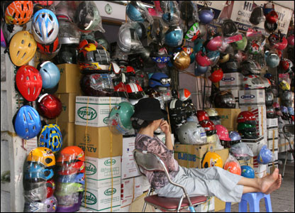ADB ước tính mỗi năm Việt Nam mất khoảng 900 triệu đô la từ chi phí y tế cho tới các ảnh hưởng kinh tế và xã hội liên quan tới tai nạn giao thông. Cửa hàng bán mũ này ở Phố Huế Hà Nội có vẻ ế ẩm, nhưng với đợt "ra quân" kiểm tra thì dự kiến sẽ có đông người tới những nơi như ở đây.