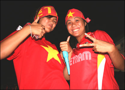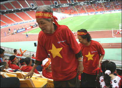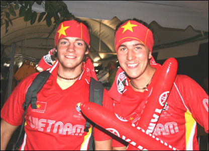 Hai người Anh này đang đi du lịch tại Thái Lan và sẽ sang Việt Nam. Họ tới sân để cổ động cho đội VN