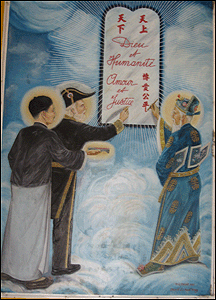 Ngay sau cửa chính là bức tranh vẽ Cao Đài Tam Thánh: Tôn Dật Tiên, Victor Hugo và Nguyễn Bỉnh Khiêm. Các nhà nghiên cứu coi Cao Đài là một tôn giáo kết hợp nhiều yếu tố Đông Tây và bản địa Việt Nam.