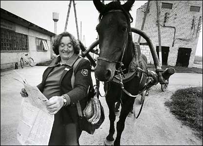 1987: Bà Anna Liepina cùng ngựa đưa thư tại nông trại Krasny Oktyabr (Tháng mười Đỏ).