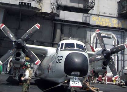 Đây chính là phi cơ COD (Carrier Onboard Delivery) chở các nhà báo đến tàu hôm 07 tháng Chín. Bình thường nó cũng là máy bay chuyên chở quân lính giữa các tàu chiến và từ đất liền ra hạm đội của Mỹ.