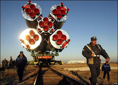 Cảnh sát Nga canh gác tàu vũ trụ Soyuz TMA-11. Tàu này sẽ chở người lên trạm không gian.