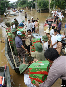 Cơ quan cứu trợ chở mỳ ăn liền tới cho ngững người còn mắc kẹt trong vùng lũ lụt.
