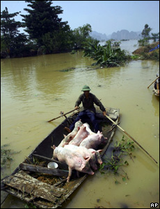Một người dân chuyển đàn lợn ra khỏi vùng bị lũ ở xã Gia Lạc, huyện Gia Viễn, tỉnh Ninh Bình.