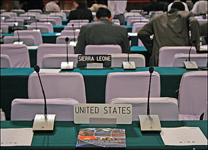 Bảng tên màu trắng cho những nước không thông qua Nghị định thư Kyoto trong đó có Mỹ. Nhưng Tổng thống Bush gần đây nói biến đổi khí hậu cần một giải pháp toàn cầu.